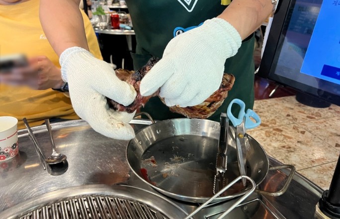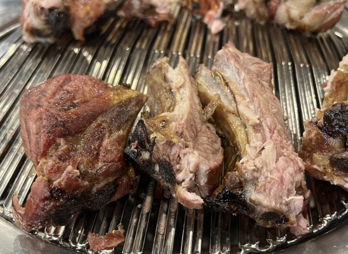 초벌 되어서 나오니까 우리 테이블에서는 살짝만 더 익혀 먹으면 되요 기름기는 쏙 빠지고 육즙은 꽉 잡혀서 나오는 그 상태... 사진 보이시죠? 저 통으로 구워진 등갈비 자태보세요
