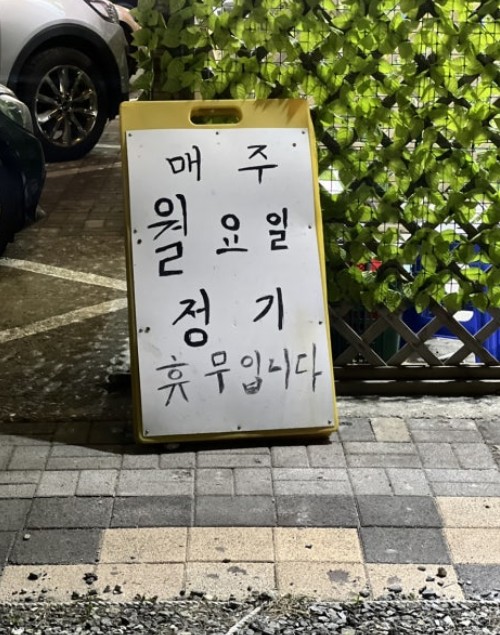 아무리 맛집이라도 문 닫았을 때 가면 허무하죠? 제가 찍어온 안내판 잘 봐두시고 . **"매주 월요일은 정기휴무"** !