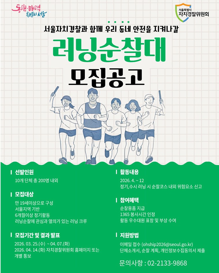 안녕하세요! 여러분, 평소처럼 러닝을 하면서 우리 동네 영웅이 될 수 있는 기회가 있다면 믿어지시나요? 오늘은 운동도 하고, 안전도 지키고, 혜택까지 챙길 수 있는 '2026 서울 러닝순찰대' 모집 소식을 들고 왔습니다! 작년에 몇몇 자치구에서 시범 운영을 했을 때 반응이 정말 뜨거웠거든요. 올해는 규모가 훨씬 커졌다고 하니, 평소 러닝 좀 하신다는 크루분들은 주목해 주세요! 서울 러닝 순찰대, 그게 정확히 뭔가요? 한마디로 **달리면서 하는 우리 동네 안전 순찰** 입니다. 거창한 건 아니고요 평소처럼 러닝 코스를 즐기면서 가로등이 꺼져 있거나, 도로가 파손되었거나, 혹은 범죄나 사고가 우려되는 위험 요소를 발견하면 전용 앱으로 신고하는 활동입니다.직접 위험에 개입하는것이 아니라. **관찰하고 신..